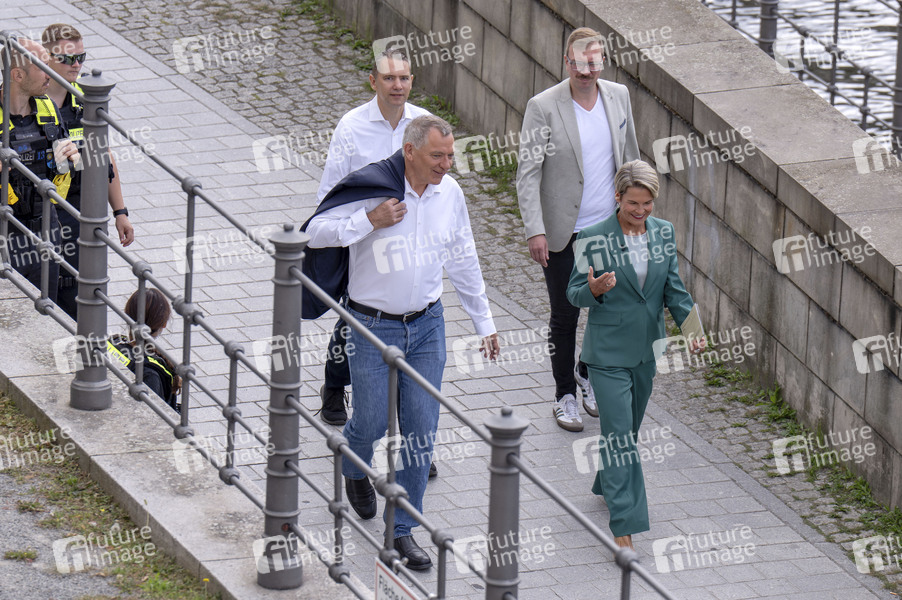 Jan van Aken und Anna Engelke beim ARD-Sommerinterview auf der Terrasse vom Marie-Elisabeth-Lüders-Haus. Berlin, 17.08.2025