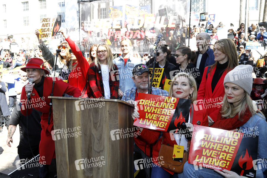 Jane Fonda, Rosanna Arquette, Bonnie Wright, Piper Perabo, Amber Valletta, Rainn Wison, Rooney Mara, Kate Mara, June Diane Raphael, Saffron Burrows und Brooklyn Decker bei der Fire Drill Fridays Kundgebung gegen den Klimanotfall vor dem Rathaus. Los Angeles, 07.02.2020