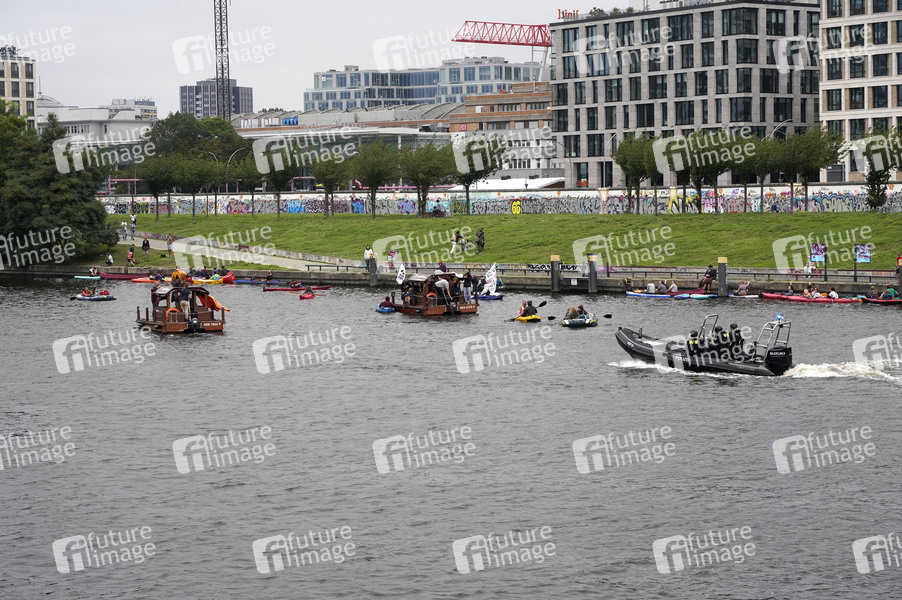 Climate and Boat - Bootsdemo auf der Spree für mehr Klimaschutz vom Berliner Jugendverband des Bundes für Umwelt und Naturschutz Deutschland mit Start an der East Side Gallery und organisiert vom Bündnis 'Berlin Erneuerbar' als Abschluss des Aktionswochenendes Gasausstieg und Wärmewende. Berlin, 28.08.2022