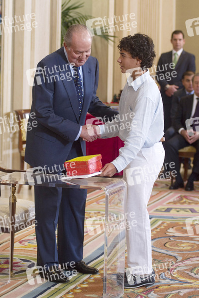 König Juan Carlos empfängt die Gewinner des 'Qué es un Rey para ti' Schulwettbewerbs im Zarzuela Palast, Madrid