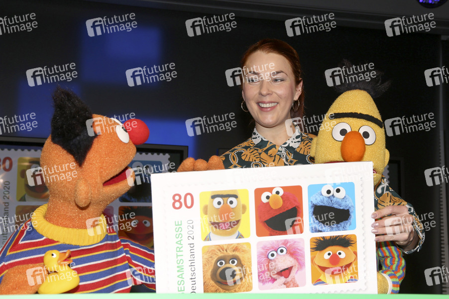 Ernie, Jennifer Dengler und Bert bei der Präsentation der Deutsche Post Sonderbriefmarke 'Sesamstraße' beim NDR am Rothenbaum. Hamburg, 02.03.2020