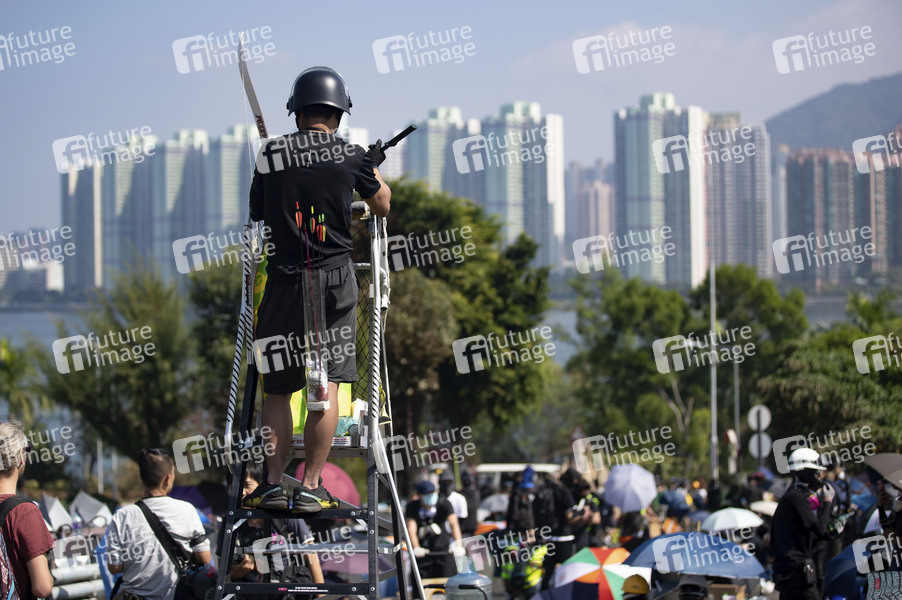 Student mit Pfeil und Bogen - Kampf an der Chinese University Hong Kong (CUHK). Hongkong protestiert seit fünf Monaten ununterbrochen. Am Montag, dem 11. November 2019, begann ein Streik in der ganzen Stadt, der Teile von Hongkong zum Erliegen brachte, als MTR-Stationen geschlossen und mehrere Straßensperren errichtet wurden. Hongkong, 13.11.2019