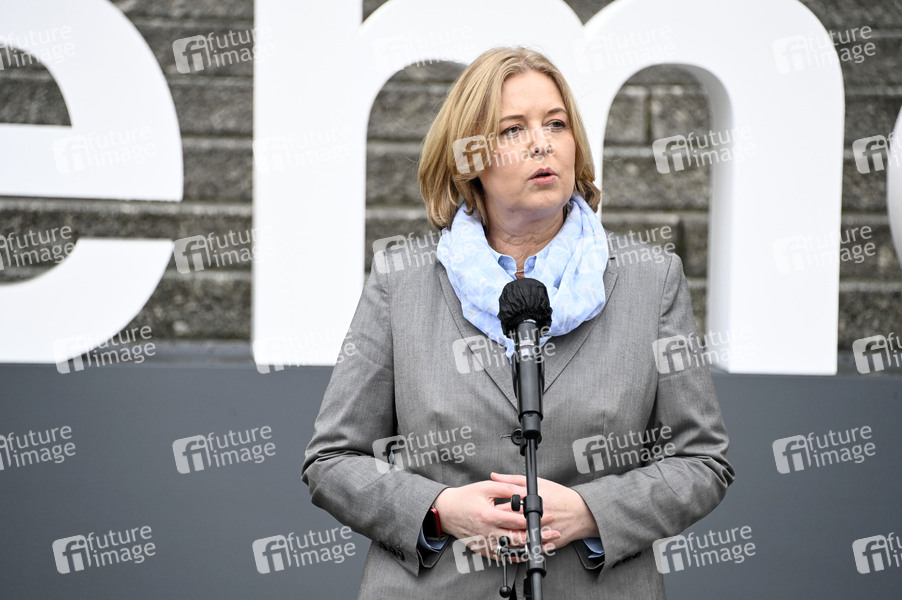 Bärbel Bas bei Pressestatements von Wolfgang Sobotka, Mickey Levy und Bärbel Bas am Schriftzug #WeRemember zur Erinnerung an die Millionen im Nationalsozialismus ermordeten Juden vor dem Reichstagsgebäude. Berlin, 25.01.2022