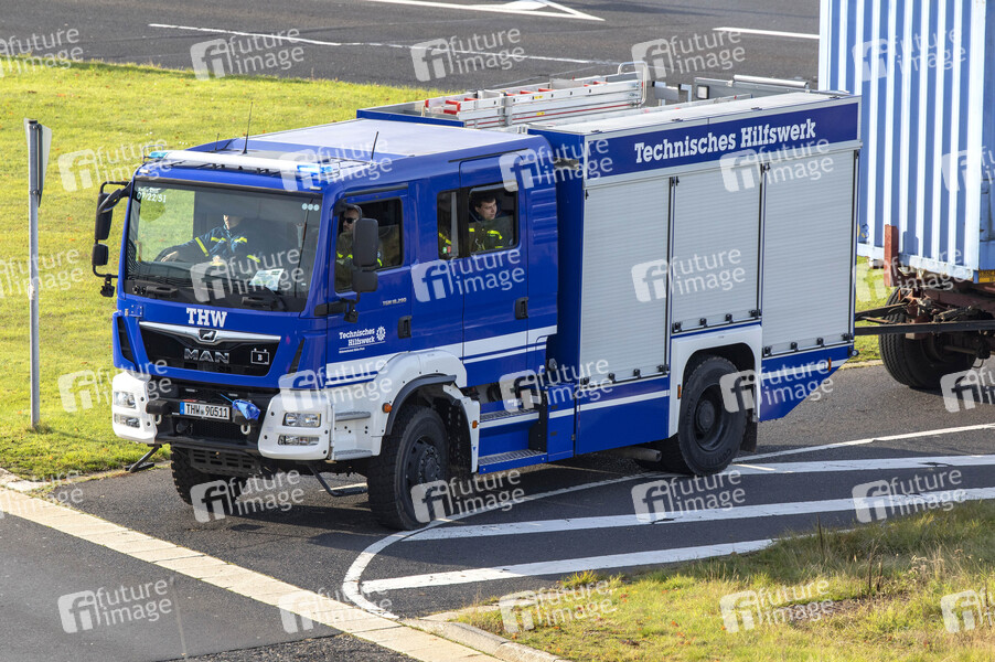 THW Einsatzfahrzeug bei der Notfallübung der Werkfeuerwehr, der Feuerwehr Köln und den Hilfsorganisationen am Flughafen Köln/Bonn. Im Rahmen der Übung wird die Kollision eines Flugzeugs mit einem Passagierbus und einer Abfertigungshalle simuliert. Einsatzkräfte retten aus dem in Brand geratenen Flugzeug und dem Gebäude Personen und versorgten diese. Köln, 06.11.2021