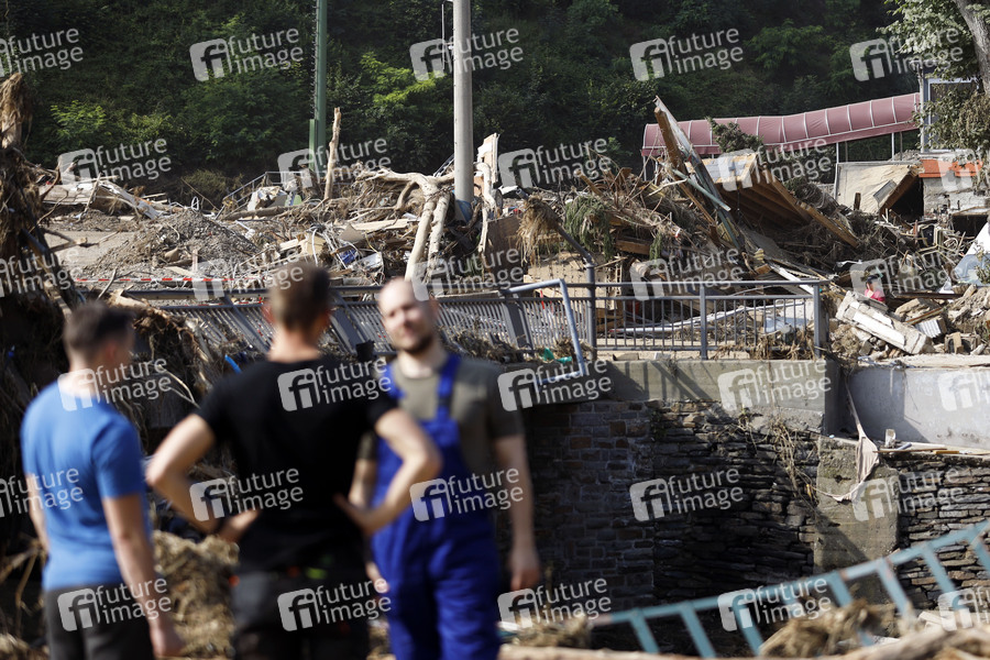 Nach dem Jahrhunderthochwasser in der Eifel durch heftige Regenfälle und Dauerregen mit Überschwemmungen und Überflutungen haben die Aufräumarbeiten im Ahrtal begonnen. Einheiten von Polizei, THW, Bundeswehr und Feuerwehr mitsamt vielen freiwilligen Helfern räumen Straßen, entfernen Schutt und Schlamm und versorgen die Menschen. Im Bild zerstörte Häuser in der Ortschaft Altenahr, in der die Flut viele Häuser zerstörte, 22.07.2021