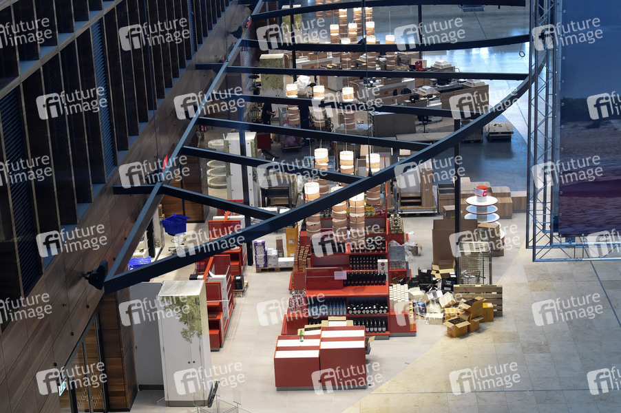 Marketbereich beim Rundgang durch den öffentlichen Bereich des Terminals 1 mit Check-in-Halle und Besucherterrasse auf dem Flughafen Berlin Brandenburg. Schönefeld, 28.10.2020