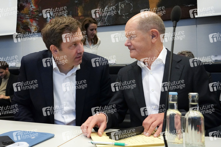 Lars Klingbeil und Olaf Scholz bei der Fraktionssitzung der SPD-Bundestagsfraktion im Reichstagsgebäude. Berlin, 28.01.2025