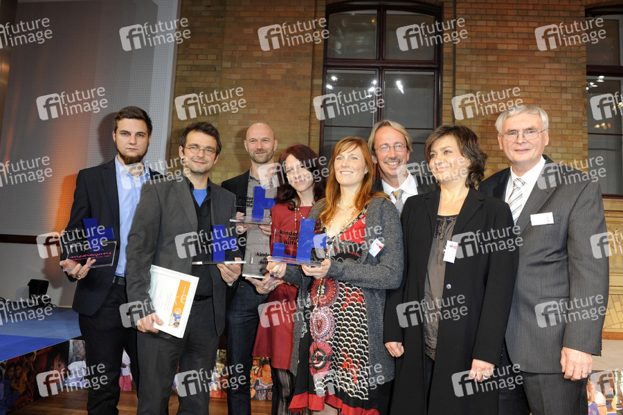 Christian Werner, Wolfgang Bauer, Thomas Brinx, Katharina Nickoleit, Henriette Bornkamm, Carl-A. Fechner, Anja Koemmerling und Juergen Thiesbonenkamp bei der Verleihung vom 15. Medienpreis der Kindernothilfe 2013 in der Hauptstadtrepräsentanz der Deutschen Telekom AG. Berlin, 15.11.2013