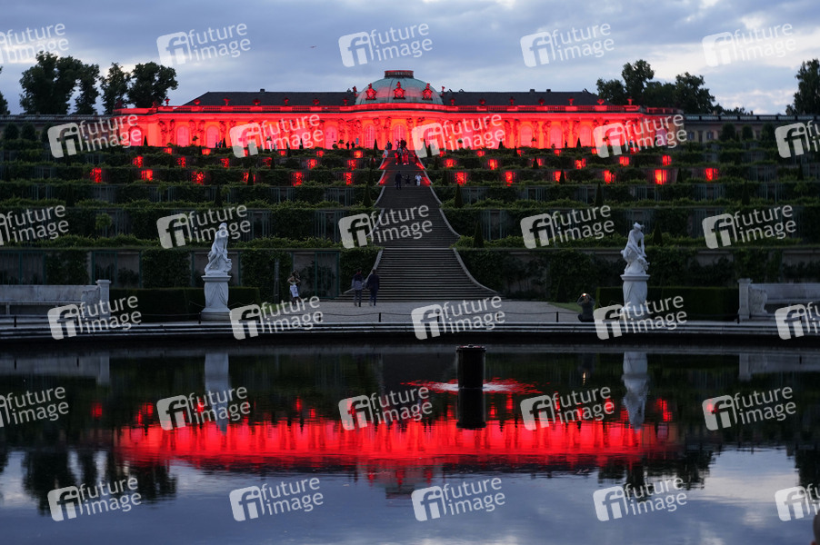 Beleuchtetes Schloss Sanssouci - Mit der bundesweiten Aktion 'Night of Light' macht die Veranstaltungsbranche auf ihre finanzielle Notlage durch die Corona-Krise aufmerksam. Potsdam, 22.06.2020