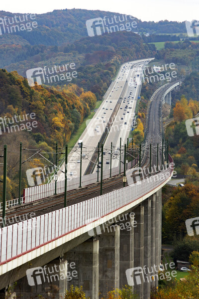 Hallerbachtalbrücke, Mobilität, Eisenbahn vs. Auto, Autobahn, Bundesautobahn, A3, Schnellfahrstrecke, Hochgeschwindigkeitstrasse, Geschwindigkeit, ICE, ICE-Strecke, Deutsche Bahn, Eisenbahn, Streckenkilometer 50, Spannbeton-Hohlkastenbrücke, Brückenbauwerk, E -Mobility, End-to-End-Tourismus, Langsamverkehr, Stau, Mixed Mobility, Zukunft, Umwelt, Diesel, Benzin, Ökostrom, Urlaub, Beton, Städteverbindung, Fahrzeuge, Wagons, Personenverkehr, Fernverkehr, Flughafenzubringer, Klimaziele, Verkehr, Symbolbild, Symbolfoto