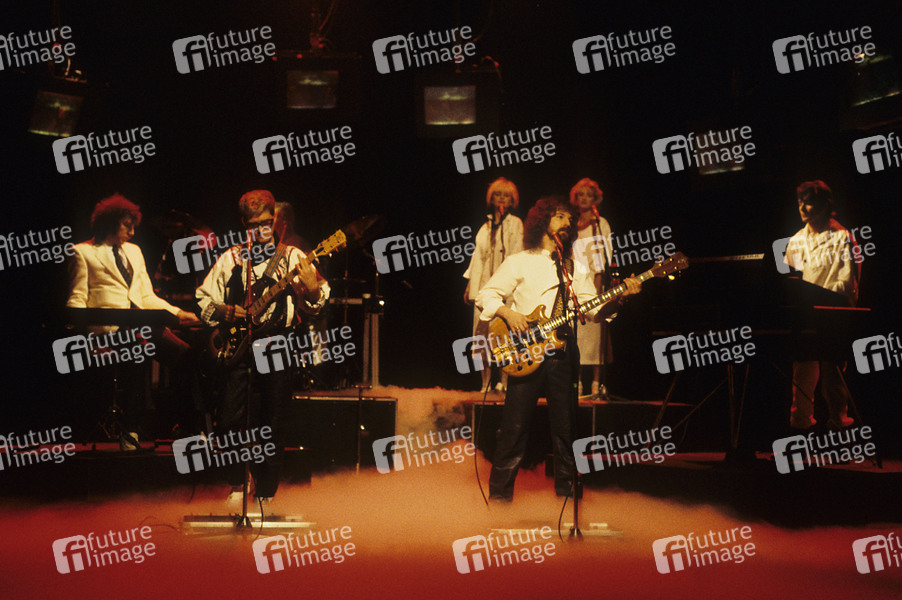 Bias Boshell, John Lees, Les Holroyd und Woolly Wolstenholme von Barclay James Harvest bei den Dreharbeiten zum Musikvideo von 'Victims of Circumstance' in den Ewart Studios. London, 28.03.1984