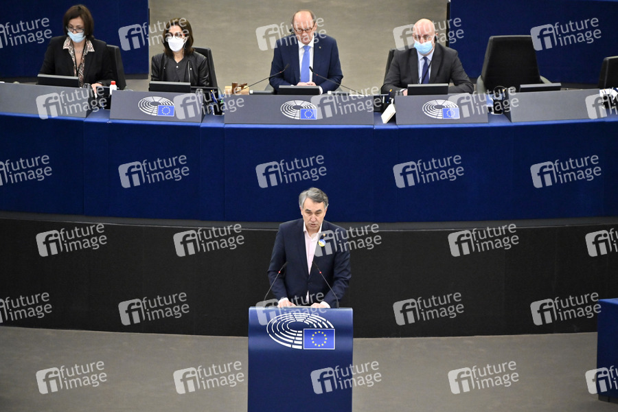 Petras Austrevicius bei einer Plenartagung zum Schutz von Kindern und jungen Menschen, die vor dem Krieg gegen die Ukraine fliehen, durch die EU im Plenarsaal des Europäischen Parlaments. Straßburg, 05.04.2022