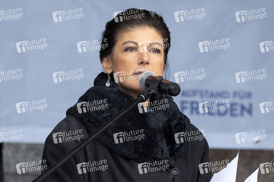 Sahra Wagenknecht auf der umstrittenen Friedensdemo und Kundgebung für Verhandlungen mit Russland statt Waffenlieferungen für die Ukraine am Brandenburger Tor. Dazu aufgerufen haben die Linken-Politikerin Sahra Wagenknecht und die Frauenrechtlerin Alice Schwarzer. Berlin, 25.02.2023