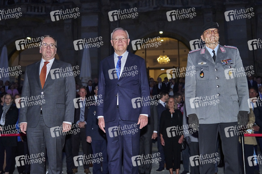 Boris Pistorius,Stephan Weil und Oberst Dirk Waldau bei der Serenade zu Ehren von Ministerpräsident Stephan Weil zu dessen Rückzug aus der Politik vor dem Gartensaal vom Neuen Rathaus. Hannover, 19.05.2025