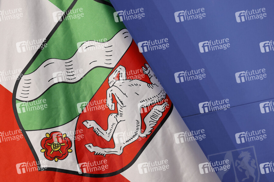 NRW-Ministerpräsident Hendrik Wüst empfängt Sternsingerinnen und Sternsinger zum traditionellen Dreikönigssingen aus den umliegenden Bistümern und nimmt ihren Segen entgegen in der Staatskanzlei Düsseldorf. Im Bild die Landesflagge mit den Landesfarben und dem Landeswappen des deutschen Bundeslandes Nordrhein-Westfalen. Düsseldorf, 01.06.2022