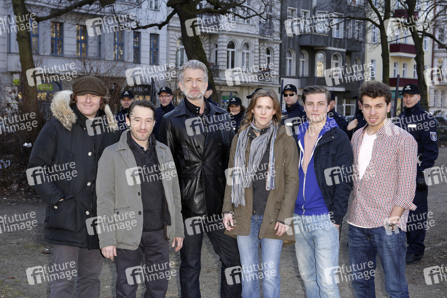 Stephan Wagner, Boris Aljinovic, Dominic Raacke, Katrin Hansmeier, Jannik Schuemann und Edin Hasanovic beim Setfototermin zum ARD-Krimi 'Tatort - Gegen den Kopf' (AT) am U-Bahnhof Schönleinstraße. Berlin, 05.03.2013