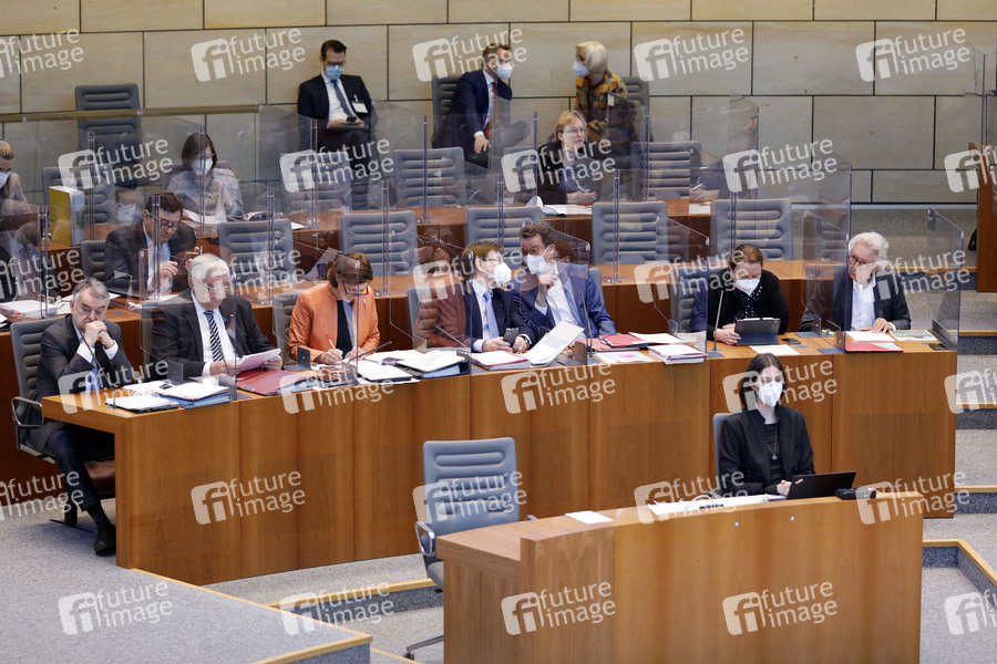 Herbert Reul, Karl-Josef Laumann, Yvonne Gebauer, Peter Biesenbach, Hendrik Wüst, Ursula Heinen-Esser und Stephan Holthoff-Pförtner bei der 125. Plenarsitzung des Landtags von NRW. Düsseldorf, 28.04.2021