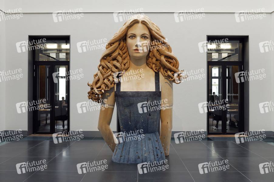 Die Holzskulptur 'Die Laborantin' von Marc Fromm steht während der bis Ende Oktober andauernden Ratspräsidentschaft des Landes Sachsen-Anhalt im Lichthof des Bundesratsgebäudes. Berlin, 26.03.2021