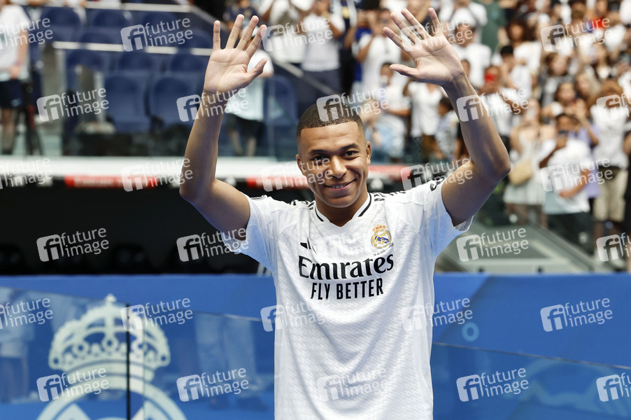 Kylian Mbappe bei der Präsentation als neuer Spieler von Real Madrid im Estadio Santiago Bernabéu. Madrid, 16.07.2024