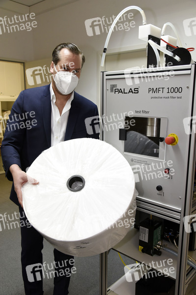 Geschäftsführer Jörg Rath mit Maskenstoff. Seine Firma Baumgartner & Rath GmbH Hightech Unternehmen beschäftigt sich u.a. mit der Produktion, der Qualitätsprüfung und dem Handel von FFP2, FFP3-Schutzmasken sowie dem Vertrieb von Covid-19-Schnelltests, Schutzkleidung und Schutzmasken. München, 18.01.2021