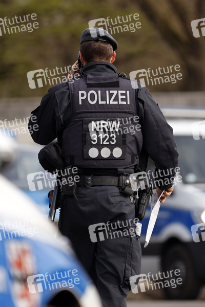 Die Stadt Leverkusen befürchtete eine größere Menschenansammlung bei der Beerdigung eines hochrangigen Clan-Mitglieds einer Großfamilie und damit Verstöße gegen die Corona-Schutzverordnung. Polizisten sichern das Gelände um den Friedhof Reuschenberg vor der Beerdigung. Leverkusen, 09.04.2021
