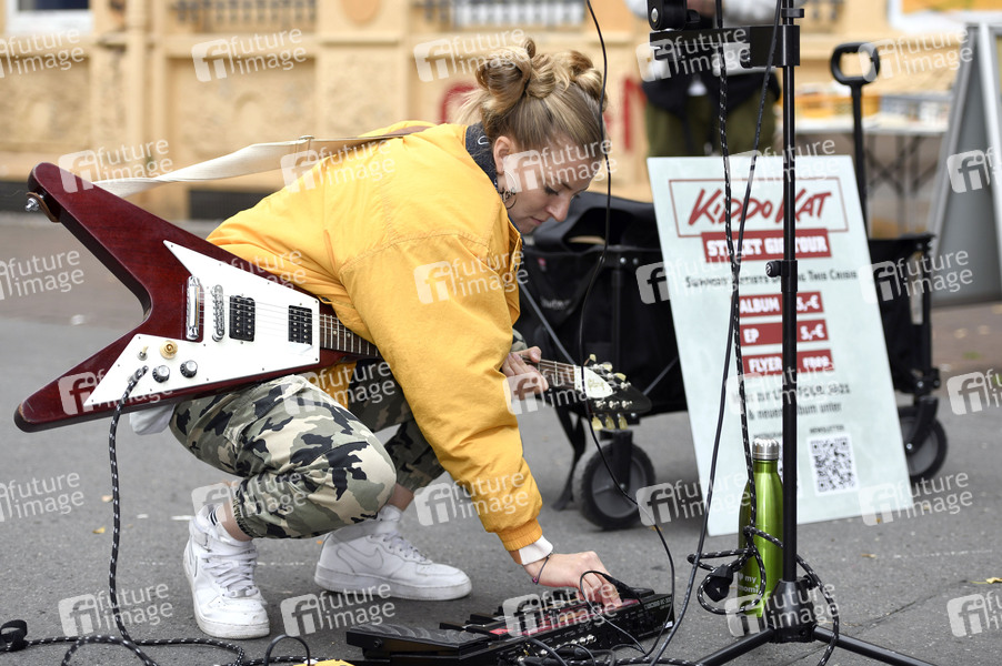 Kiddo Kat spielt ein Straßenkonzert im Rahmen ihrer Street Gig Tour während der Corona-Pandemie in der Limmerstraße. Hannover, 05.10.2020