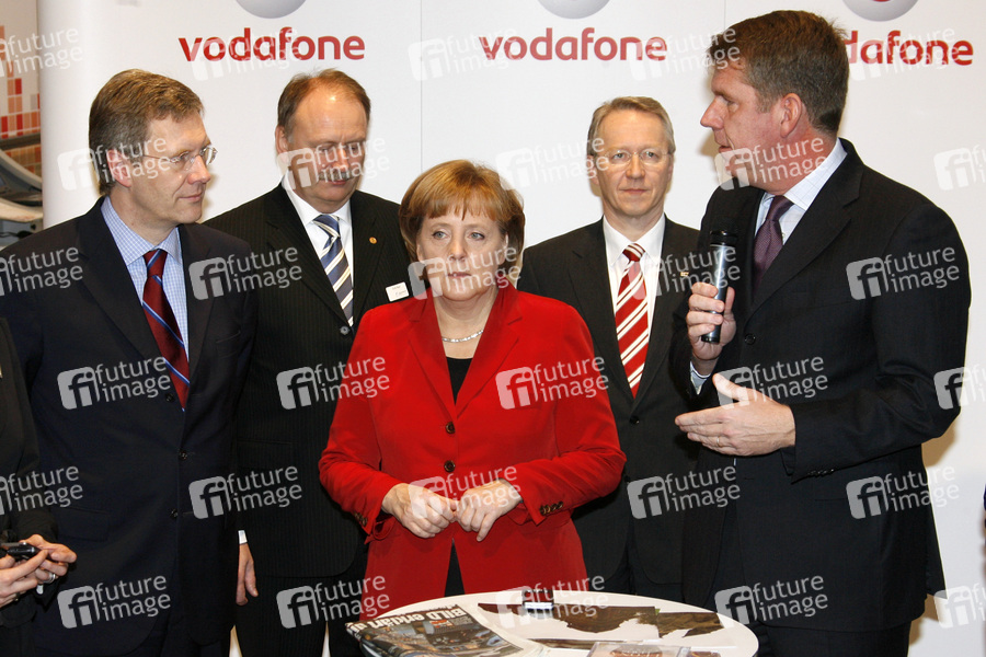 Eröffnungsrundgang der Bundeskanzlerin zur CeBIT 2008 (Centrum der Büro- und Informationstechnik), der weltgrößten Messe für Informations- und Computertechnik auf dem Messegelände in Hannover. Am Stand von Vodafone.