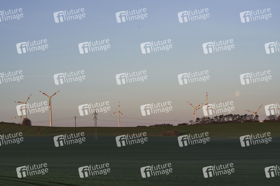 Vollmond über Windkraftanlage. (Symbolbild, Themenbild) Bremke, 30.03.2021