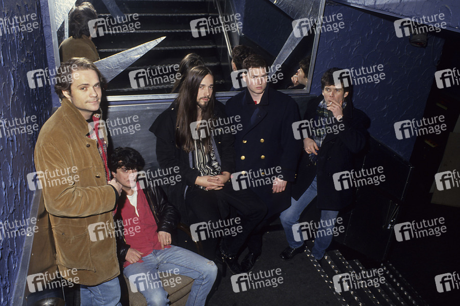 Gord Downie, Paul Langlois, Rob Baker, Johnny Fay und Gord Sinclair von The Tragically Hip bei einem Photoshooting im Kaiserkeller. Hamburg, 10.08.1990