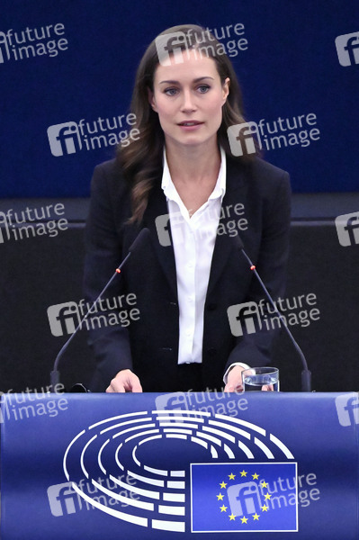Sanna Marin spricht vor dem Parlament im Plenarsaal des Europäischen Parlaments. Straßburg, 13.09.2022