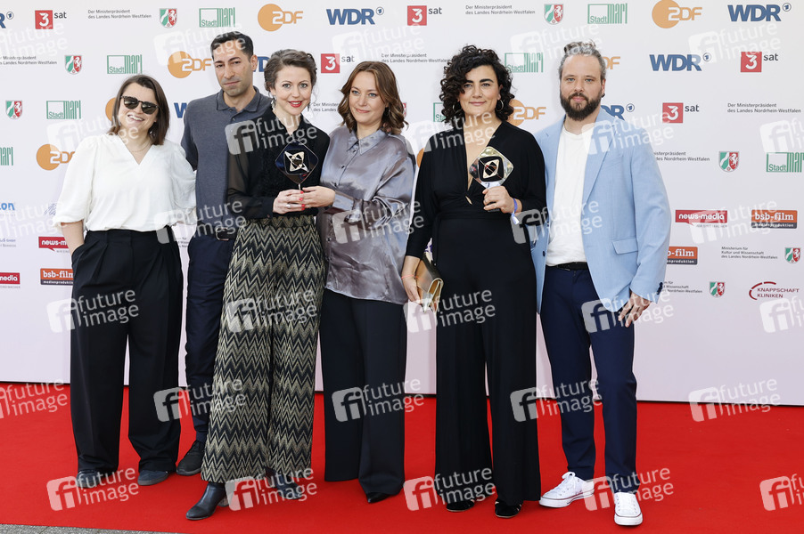 Sara Günter, Arash Asadi, Meret Madörin, Antonia Kilian, Bahar Bektas und Tobias Carlsberg bei der 61. Verleihung des Grimme Preises 2025 im Theater Marl. Marl, 04.04.2025