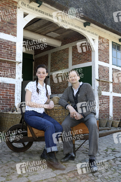 Maria Ehrich und Milan Peschel beim Fototermin am Set zum ZDF Film 'Altes Land' im Motiv 'Hof Ida'. Jork, 23.04.2019