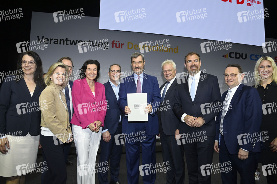 Martina Englhardt-Kopf, Daniela Ludwig, Dorothee Bär, Alexander Dobrindt, Markus Söder, Alois Rainer, Florian Hahn und weitere bei der Unterzeichnung des Koalitionsvertrages zwischen CDU, CSU und SPD im Gasometer Schöneberg. Berlin, 05.05.2025