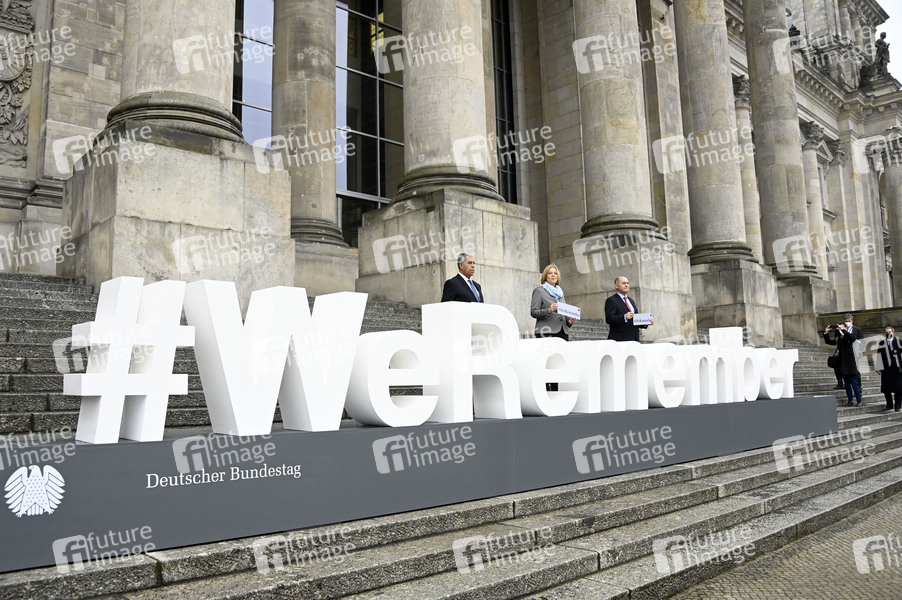 Mickey Levy, Bärbel Bas und Wolfgang Sobotka bei den Pressestatements von Wolfgang Sobotka, Mickey Levy und Bärbel Bas am Schriftzug #WeRemember zur Erinnerung an die Millionen im Nationalsozialismus ermordeten Juden vor dem Reichstagsgebäude. Berlin, 25.01.2022