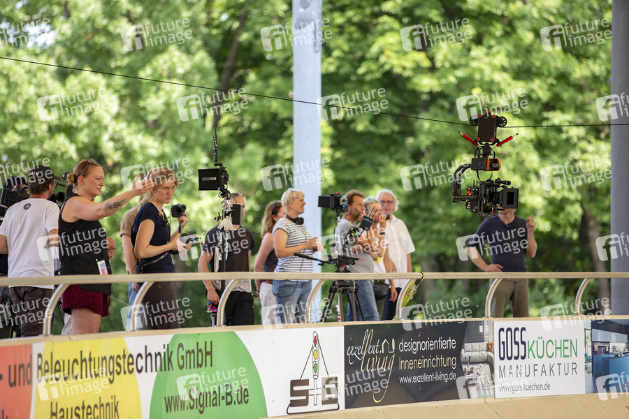 Kim Strobl mit Filmteam beim Fototermin am Set des Kinofilms 'Madison' auf der Radrennbahn Andreasried. Erfurt, 04.06.2019