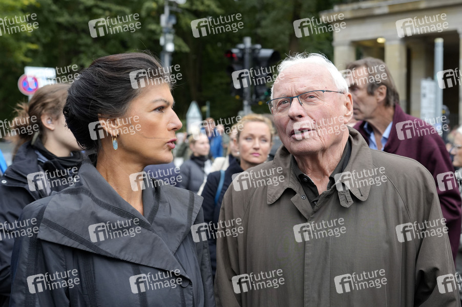 Sahra Wagenknecht und Oskar Lafontaine bei der Friedensdemonstration unter dem Motto 'Nein zu Krieg und Hochrüstung! Ja zu Frieden und internationaler Solidarität' vor der Siedessäule am Großen Stern. Berlin, 03.10.2024