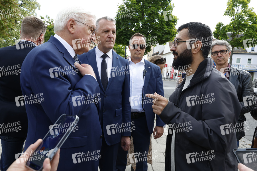 Frank-Walter Steinmeier mit Bürgermeister Manfred Wilde auf dem Weg durch die Stadt Delitzsch zum Rathaus. Steinmeier verlegt seinen Amtssitz für drei Tage nach Sachsen. Der Besuch im Landkreis Nordsachsen ist Teil der Reihe 'Ortszeit Deutschland', bei der das Staatsoberhaupt regelmäßig in verschiedene Regionen reist, um mit Bürgerinnen und Bürgern ins Gespräch zu kommen und die Entwicklung vor Ort kennenzulernen. Delitzsch, 20.05.2025