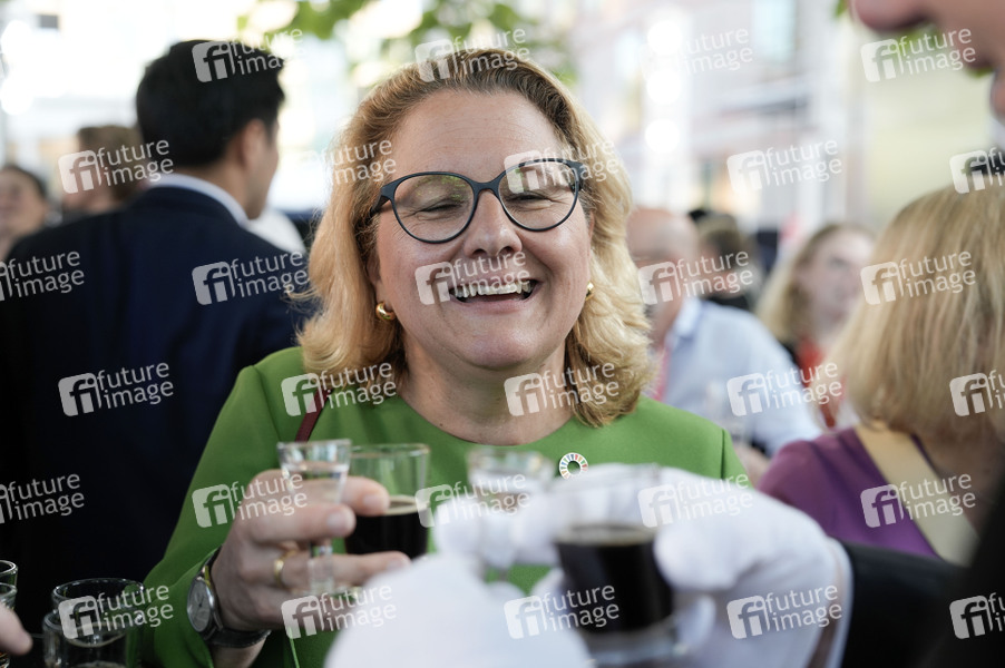 Svenja Schulze mit einem Lüttje Lage beim Sommerfest der Niedersächsischen Landesregierung 2024 in der Vertretung des Landes Niedersachsen beim Bund. Berlin, 24.06.2024