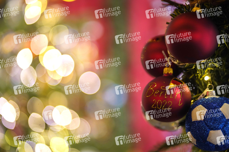 Weihnachtsglaskugel mit Aufschrift Berlin 2022 an einem geschmückten Weihnachtsbaum