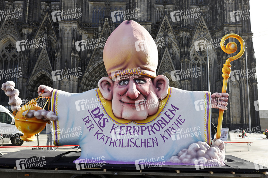 Künstler, Karneval, Karnevalswagenbauer, Skulptur, Plastik, Erzbistum Köln, Kölner Dom, Domstadt, Kirchenskandal, Kindesmissbrauch, Missbrauch, Aufarbeitung, Verzögerung, Verschleppung, Gutachten, Vertrauenskrise, Erzbischof, Kardinal, Gutachter, Missbrauchsfälle, Opfer, Entschädigung, unter Verschluss, Verdachtsfälle, Kirche, Kirchenaustritte, Kirchenaustritt, Kirchensteuer, Glaube, Konfession, Religion, Katholiken, Austrittswelle, katholische Kirche, Erzbischof Reiner Maria Woelki, Kardinal, Karikatur, Kirchenkritik, Kirchenkritiker, Priester, Pfaffen, Klerus, Sexualmoral, Motivwagen, Scheinheiligkeit, Bischofskonferenz, Bistum, Missbrauchsskandal, Symbolbild, Symbolfoto, Themenbild