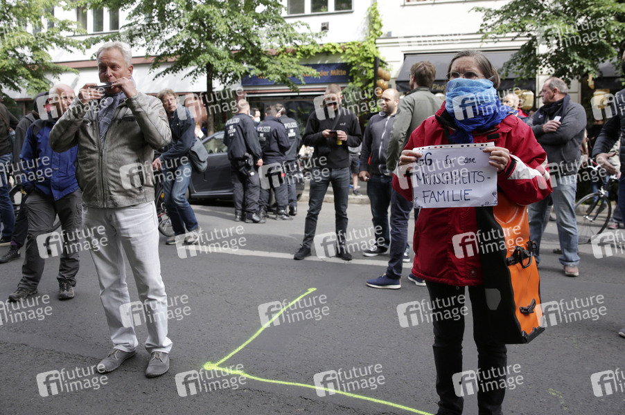 In der Rosa Luxemburg Straße demonstrieren Anhänger der 'Hygienedemo' gegen die Coronamaßnahmen der Bundesregierung. Am Alexanderplatz sollen ab 14 Uhr insgesamt zehn Kundgebungen starten. Berlin, 16.05.2020