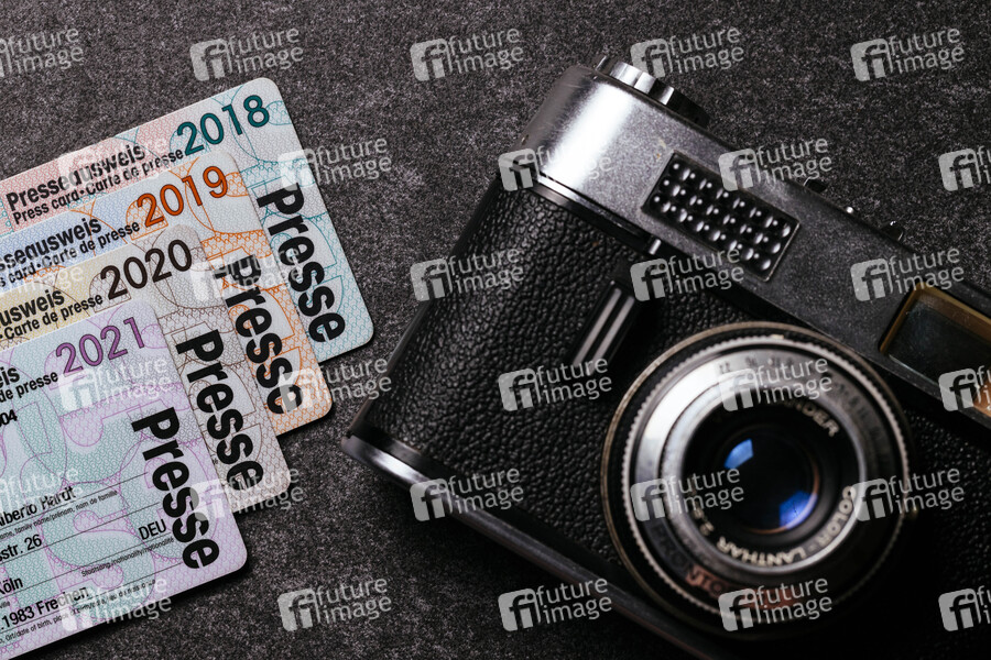 Presseausweise liegen auf einer Platte neben einer alten Fotokamera. (Themenbild, Symbolbild)