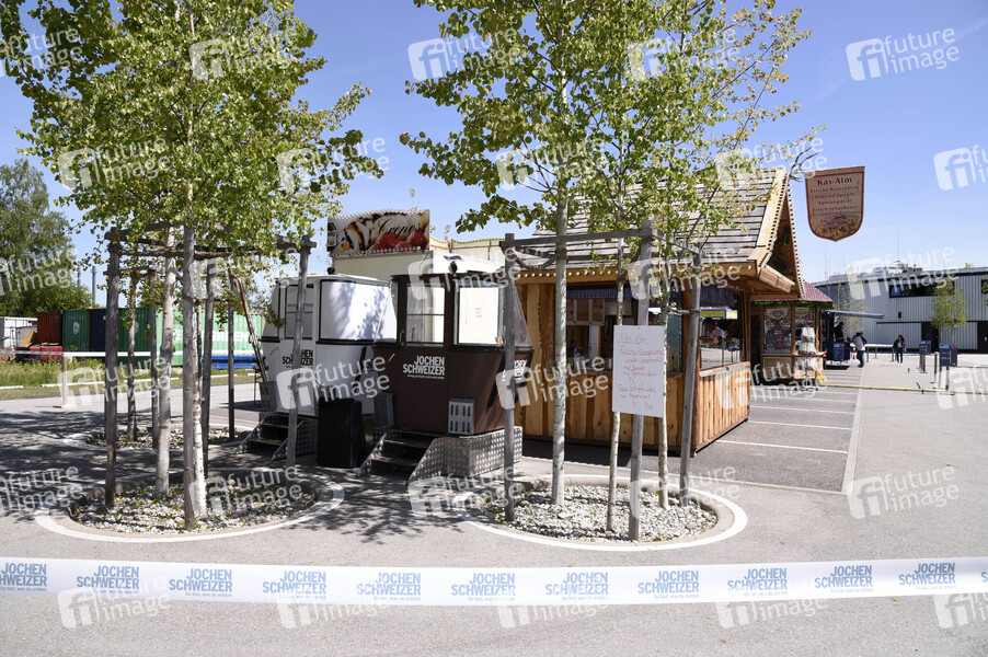 Das Volksfest Taufkirchner Auto Dult auf dem Gelände der Jochen Schweizer Arena ist in Corona-Zeiten an folgende Bedingungen geknüpft: Abholung nur als Drive-In, Bestellung am Auto, Mundschutz tragen und Verzehr nur im Auto oder Zuhause erlaubt. Taufkirchen, 08.05.2020