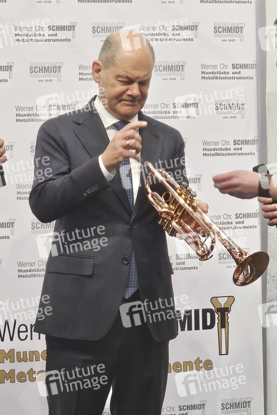 Olaf Scholz am Stand von Werner Chr. Schmidt - Mundstücke und Metallblasinstrumente auf der Internationalen Handwerksmesse auf dem Messegelände. München, 14.03.2025