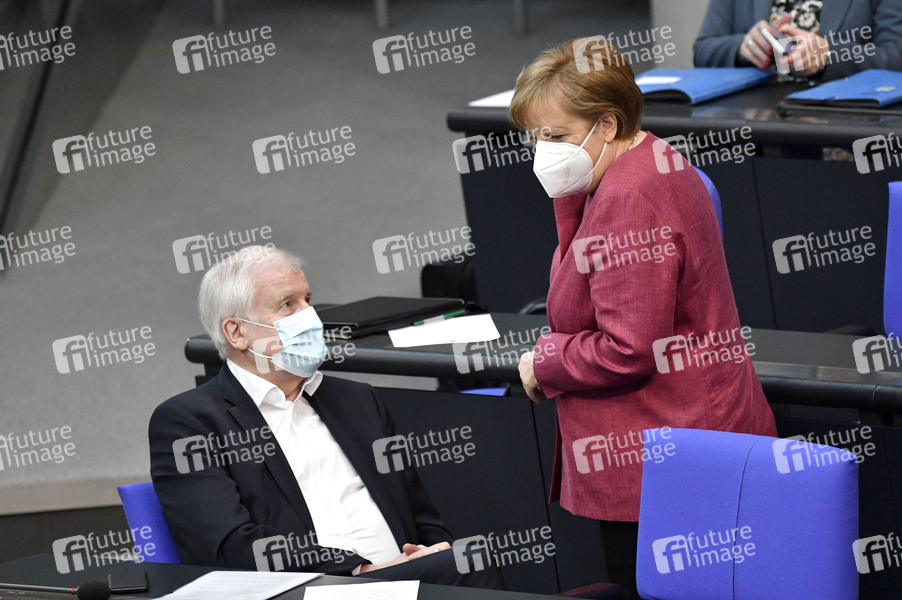 Horst Seehofer und Angela Merkel in der 222. Sitzung des Deutschen Bundestages im Reichstagsgebäude. Berlin, 16.04.2021