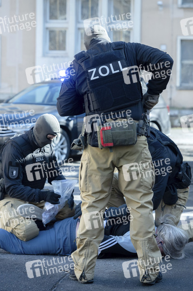 Vorführung eines Zugriffs durch Zoll-Einsatzkräfte nach der Pressekonferenz zur Vorstellung des Aktionsplans gegen Organisierte Kriminalität im Zollfahndungsamt Berlin-Brandenburg. Berlin, 25.02.2026
