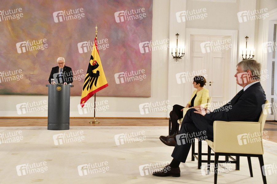 Frank-Walter Steinmeier, Helene Miard-Delacroix und Eckart Conze bei der Ansprache des Bundespräsidenten und Gespräch mit Historikerinnen und Historikern zum 150. Jahrestag der Gründung des Deutschen Reiches im Schloss Bellevue. Berlin, 13.01.2021