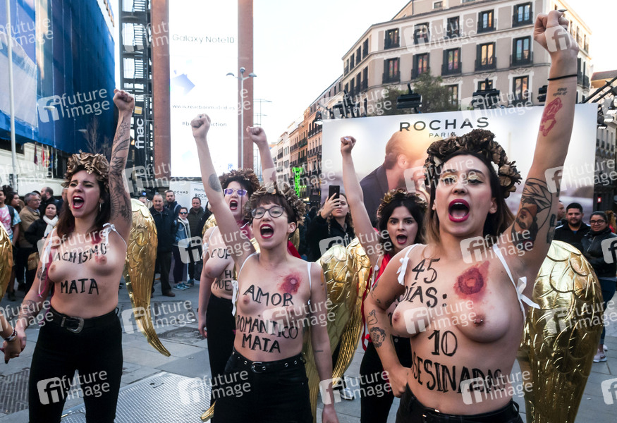 Femen Aktivistinnen bei einer Demonstration gegen Gewalt gegen Frauen am Valentinstag auf dem Plaza del Callao. Madrid, 14.02.2020