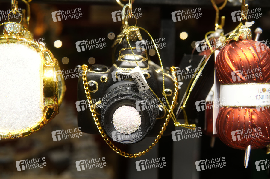Fotokamera- und Wollknäul-Weihnachtsbaumanhänger auf dem City-Weihnachtsmarkt an der Gedächtniskirche auf dem Breitscheidplatz. Berlin, 16.12.2024