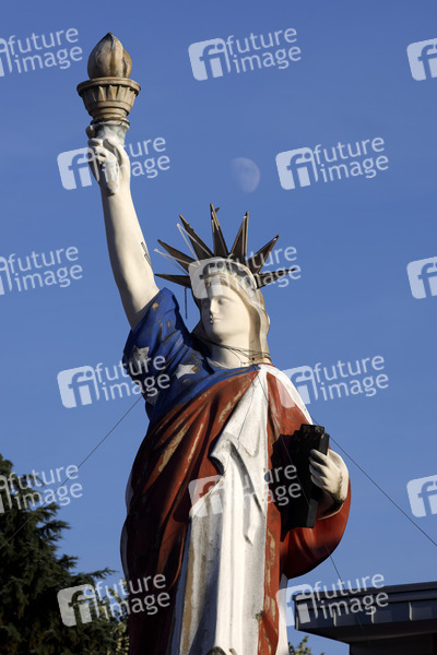 Statue of Liberty, Lady Liberty, Model, Amerikanismus, US-Kultur, us-amerikanisch, Skulptur, Neoklassizismus, neoklassizistisch, Libertas, römische Göttin der Freiheit, Wahrzeichen, Demokratie, Freiheit, abendländische Kultur, Einheitskultur, Nachbau, Fackel, Leuchtfeuer, Tafel mit Datum der Unabhängigkeit, Declaration of Independence, Symbolbild, Symbolfoto